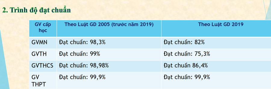 Cũng theo ông Đức, nếu theo Luật Giáo dục năm 2019, tỉ lệ giáo viên mầm non, tiểu học, THCS, THPt đạt chuẩn lần lượt là: 82%, 75,3%, 86,4% 86,4%. Cụ thể: