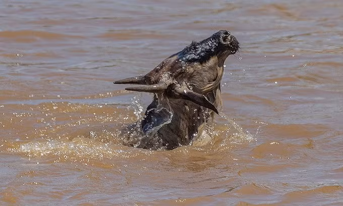 Adrian Burrows, nhiếp ảnh gia bán thời gian 50 tuổi đang sống ở Durban, Nam Phi, ghi lại khoảnh khắc con cá sấu nặng gần 230 kg để mắt tới đàn linh dương đầu bò và khéo léo bơi bên cạnh chúng để chọn con mồi tiềm năng ở Maasai Mara, Kenya.