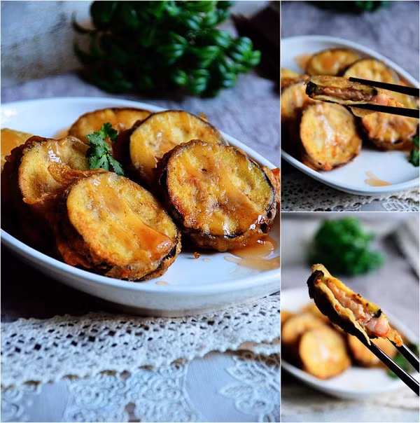 Cà tím kẹp tôm chiên là một món ăn khá bắt mắt với vẻ vàng giòn quyến rũ bên ngoài. Không chỉ vậy, món ăn cũng hấp dẫn bởi phần nhân đặc biệt bên trong.