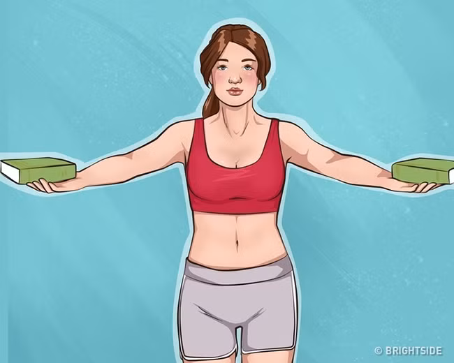 Bạn đứng thẳng, giơ 2 tay về phía trước với lòng bàn tay hướng lên trên. Đặt lên mỗi bàn tay 1 cuốn sách dày (hoặc vật gì đó cân bằng và có khối lượng tương tự).
