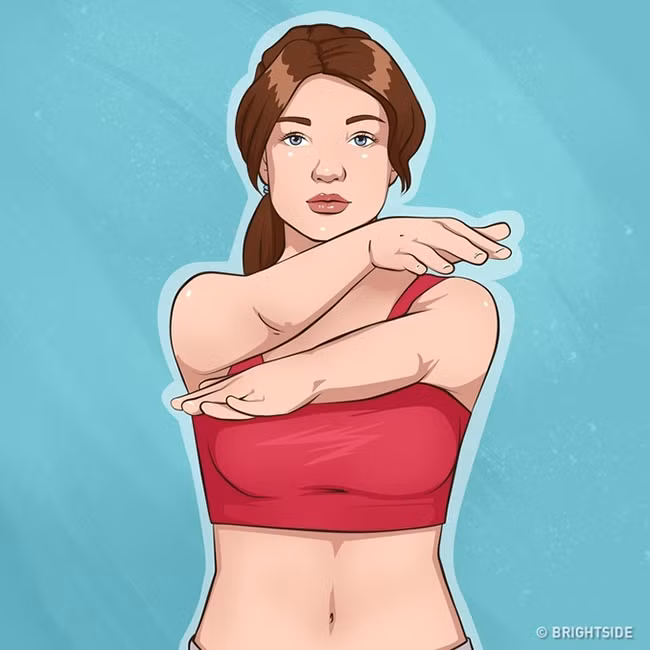 Đứng thẳng với chân rộng bằng vai, đưa hai tay của bạn ra hai bên và sau đó trở về trước mặt, với một tay chồng lên tay khác, giống như chữ X.