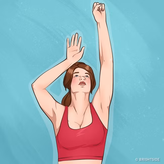 Đứng thẳng, ngửa đầu ra sau. Vươn một cánh tay lên cao hết cỡ và nắm tay lại như thể bạn đang bắt lấy một vật gì đó. Lặp lại động tác này 10 lần mỗi tay.