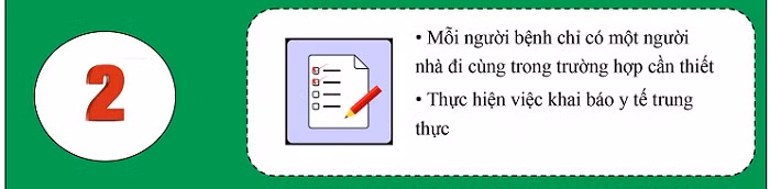 2. Mỗi người bệnh chỉ có 1 người nhà đi cùng trong trường hợp cần thiết. Thực hiện việc khai báo y tế trung thực.
