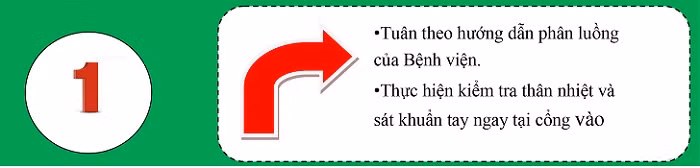 1. Tuyệt đối tuân thủ theo hướng dẫn phân luồng của bệnh viện.Thực hiện kiểm tra thân nhiệt và sát khuẩn tay ngay tại cửa vào.
