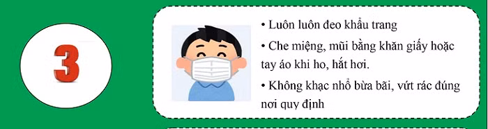 3. Luôn luôn đeo khẩu trang che kín mũi, miệng. Che miệng, mũi bằng khăn giấy hoặc tay áo khi ho, hắt hơi.