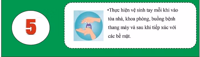5. Thực hiện vệ sinh tay mỗi khi vào tòa nhà, khoa phòng, buồng bệnh thang máy và sau khi tiếp xúc với các bề mặt.
