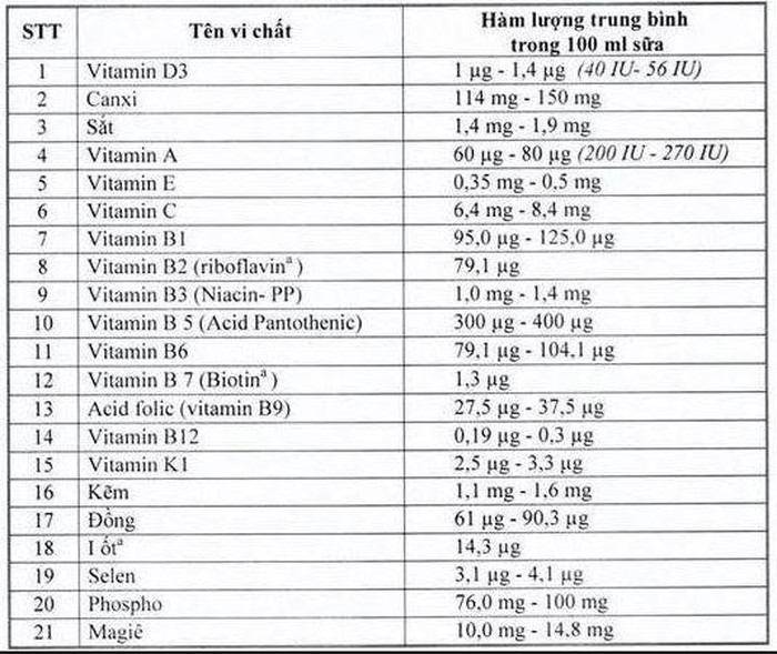 Danh sách các loại vitamin, khoáng chất cần có trong sản phẩm dùng cho chương trình Sữa học đường do Bộ Y tế quy định với hàm lượng cụ thể