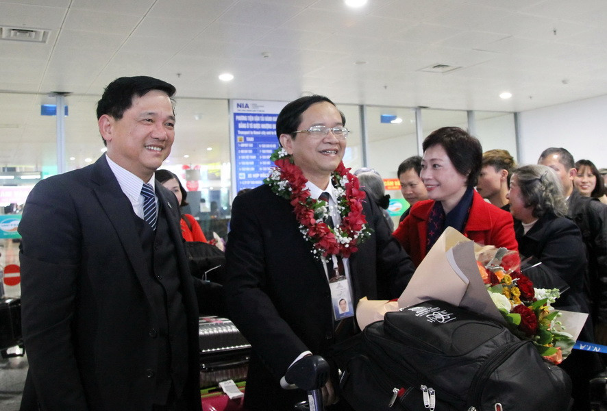 | Lãnh đạo Sở GD&ĐT Hà Nội chúc mừng thành tích của đoàn học sinh Việt Nam tham dự IJSO tại sân bay Nội Bài. |