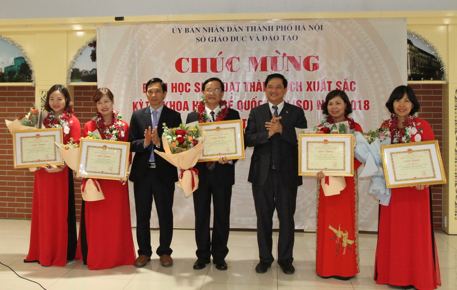 Lãnh đạo Sở GD&ĐT Hà Nội tặng giấy khen cho các học sinh đạt thành tích cao.