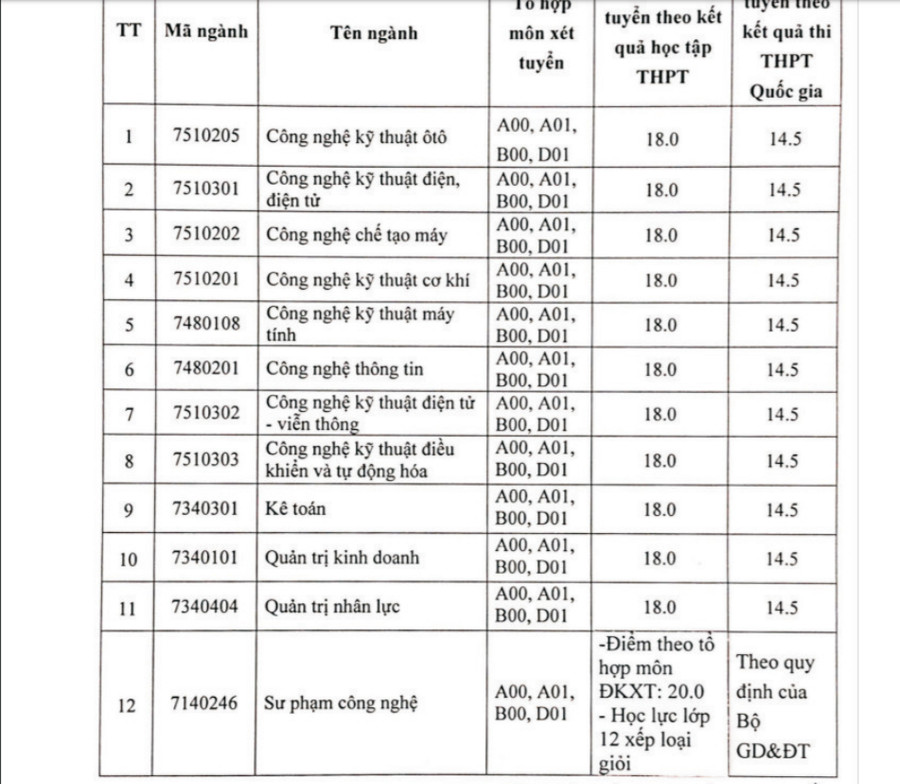 Trường Đại học Sư phạm Kỹ thuật Vinh, các ngành Sư phạm có điểm chuẩn bằng ngưỡng xét tuyển của Bộ Giáo dục và Đào tạo là 18 điểm. Các ngành còn lại đều lấy 14,5 điểm.