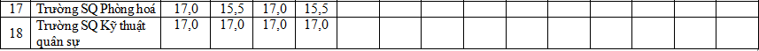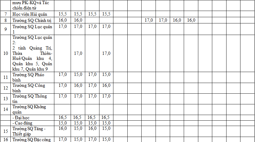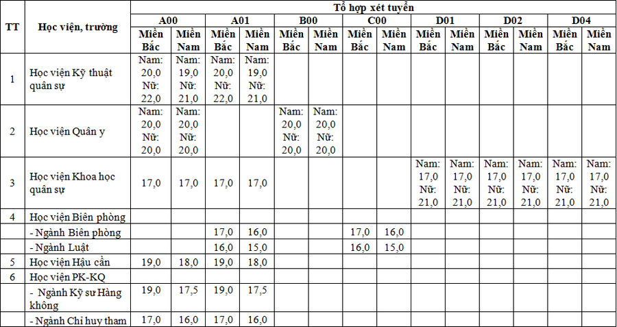 Lưu ý: Học viện Biên phòng, Trường Sĩ quan Lục quân 2 tuyển sinh thí sinh phía Nam theo từng quân khu gồm: 2 tỉnh Quảng Trị, Thừa Thiên-Huế/Quân khu 4, Quân khu 5, Quân khu 7, Quân khu 9;