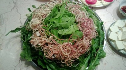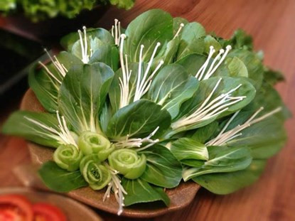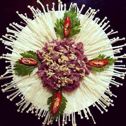 Với món thịt bò. Nếu cầu kì bạn có thể cuốn cùng nấm kim châm hoặc sắp xếp như trên.