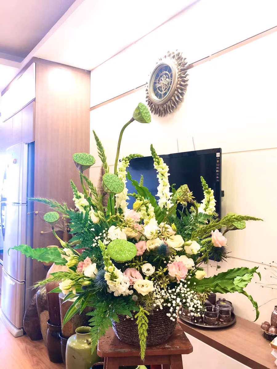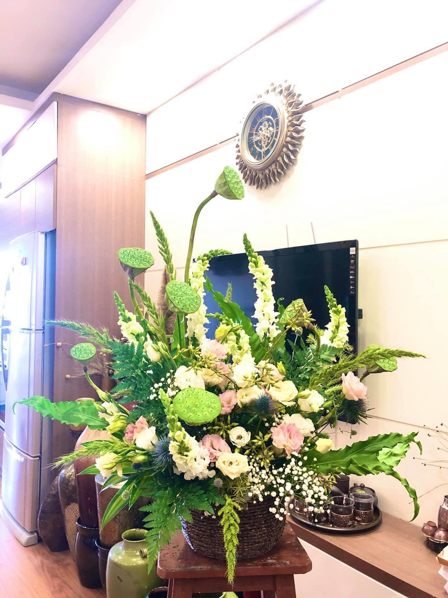 Mẹ đảm Nguyễn Thu Hà (Hà Nội) đã chia sẻ những giỏ hoa do chính tay chị cắm, rất đơn giản nhưng vẫn xinh lung linh.