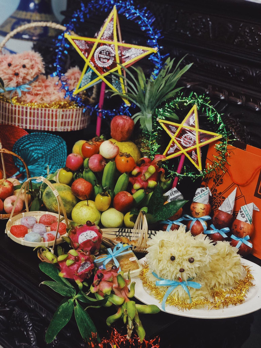 Trái cây tươi: Nải chuối chín vàng, quả hồng (ý nghĩa no đủ), quả na (có nhiều mắt mang ý nghĩa sinh sôi), quả bưởi (mang ý nghĩa cầu điềm lành), quả lựu (may mắn). Quý bạn có thể cắt tỉa các loại quả cho thêm đẹp mắt và ấn tượng.