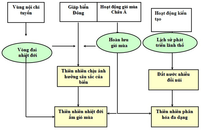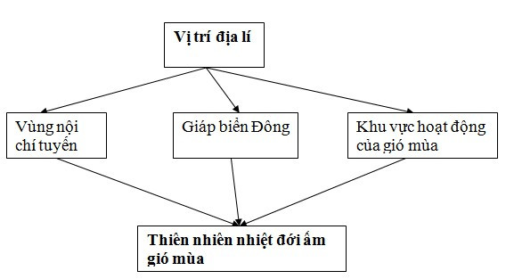Đối với đối tượng là học sinh khá, giỏi, giáo viên cơ thể sử dụng sơ đồ dưới đây để giải thích cho học sinh về mối liên hệ giữa vị trí địa lí với các đặc điểm chung của tự nhiên Việt Nam. Tuy nhiên với sơ đồ này, giáo viên phải mở rộng cho học sinh nhều kiến thức nên phương pháp đi kèm là giảng giải, tức là giáo viên đưa sơ đồ ra trước và giải giải cho học sinh.