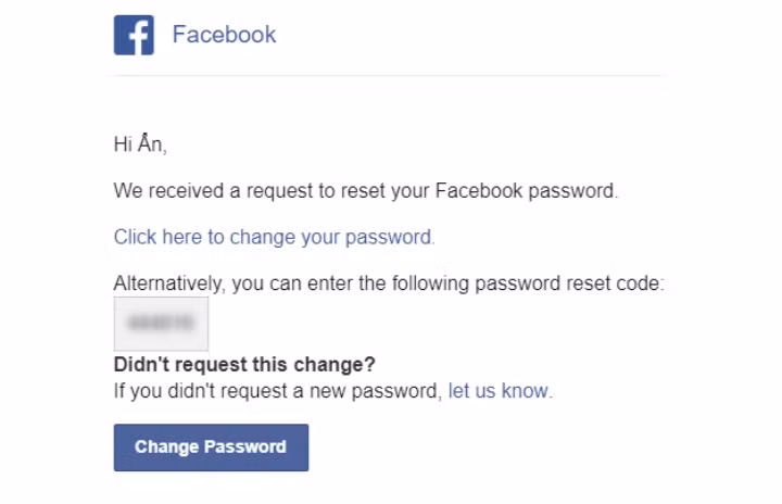 Nếu chọn cách này, Facebook sẽ gửi mã khôi phục vào địa chỉ email bạn dùng để đăng đăng ký tài khoản. Sau khi nhận mã, bạn có thể nhấp chuột vào đường dẫn Click here to change your password, chép mã khôi phục, và sau đó dán nó vào trang khôi phục mật khẩu Facebook. Nếu không muốn sao chép và dán mã, bạn chỉ cần bấm nút Change password trong email.