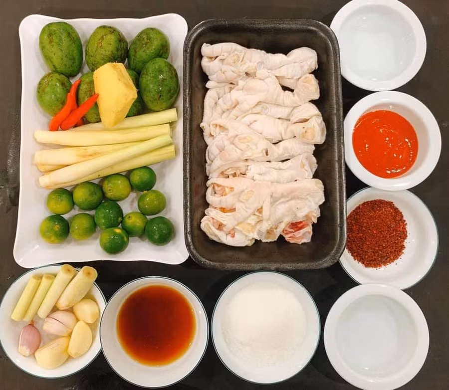 - Sả thái lát, quất cắt đôi, lá chanh thái, ớt thái lát.