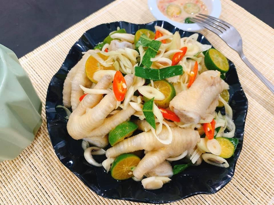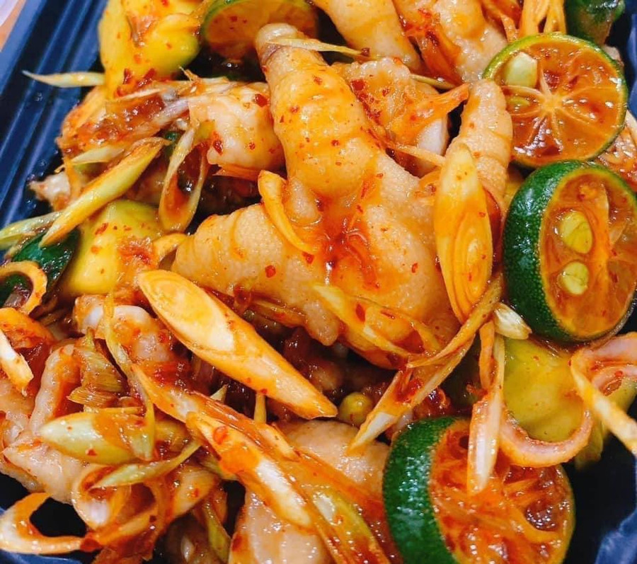 Thái sả, quất, xoài xanh hoặc cóc cùng nước sốt cho vào chân gà đảo đều, nêm nếu nhạt cho thêm sốt. Để ngăn mát 3 tiếng là ăn được.