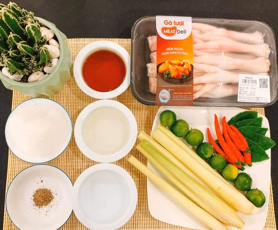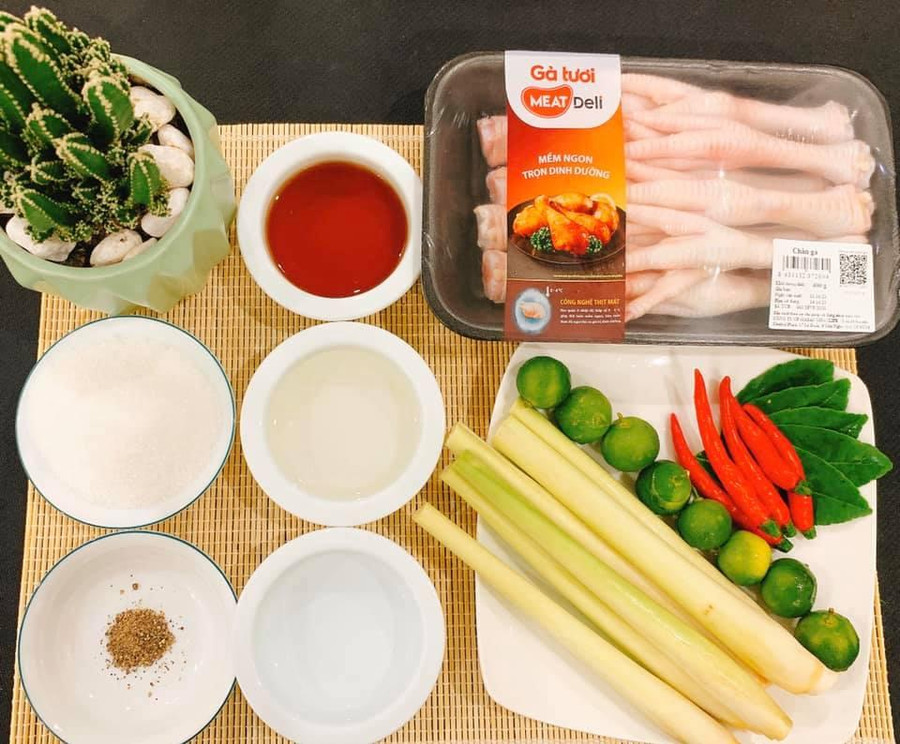 Chân gà rút xương hoặc không rút xương, cắt đôi, rửa qua nước muối. Luộc sôi 5 phút cùng gừng cho thơm. Vớt chân gà vào chậu nước lạnh, để chân gà cho ráo nước.