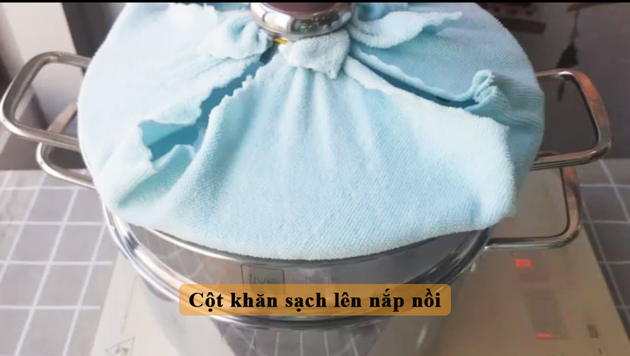 Cột một miếng khăn bên trong nắp nồi hấp.