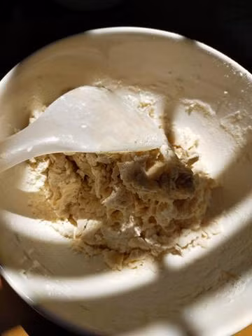 - Cho men nở, đường, nước vào tô, khuấy đều.