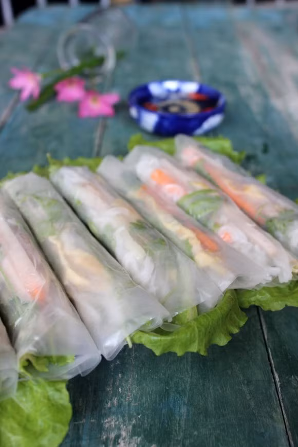 Đặt hành củ và trải dài ra, xếp lần lượt bún, tôm, thịt, rau răm, trứng tráng, rau mùi. Xếp gọn ngang chiều của củ hành để quấn.