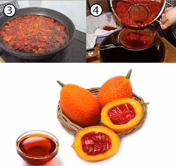 - Đổ hỗn hợp màng gấc sau khi xay nhuyễn cắt nhỏ và nồi gang đế dày chứa ngập dầu dừa hay dầu ô liu. Đun sôi trên lửa ở 70 độ C liên tục trong 30-45 phút.