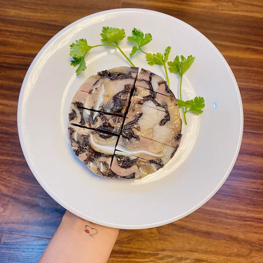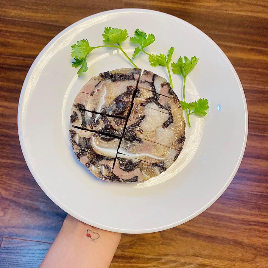 - Lót lá chuối vào khuôn trước. Sau đó xào tai mũi lưỡi. Chú ý là xào vừa đủ 1 khuôn. Đảo đều tay. Xào kĩ cho đến khi ra mỡ và miếng thịt săn lại. Đổ mộc nhĩ đã xào vào đảo đều. Nếm cho vừa. Cho chút bột ngọt và nhiều hạt tiêu (hạt tiêu chỉ giã dập).