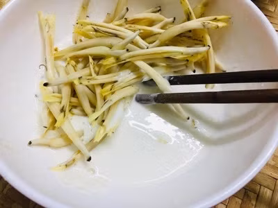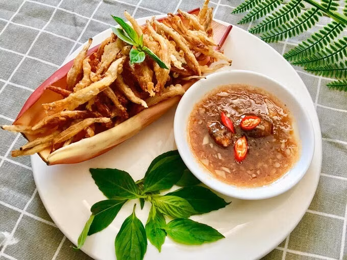 Bước 5: Hoa chuối sau khi để ráo dầu thì cho ra đĩa chấm cùng sốt me.