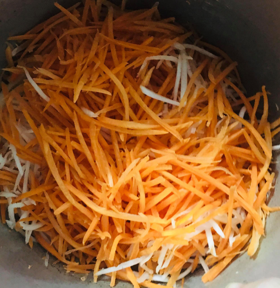 Cà rốt, củ cải nạo sợi. Trộn nước sốt vừa làm trên vào, cả gia vị xay nhỏ, hành lá, hẹ. Trộn đều để tầm 20p cho sốt ngấm.