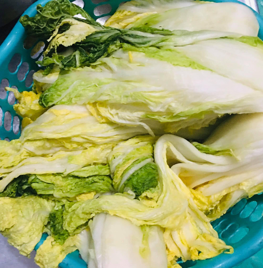 Đặt cải thảo vào trong 1 chậu rộng, lấy thớt nặng đè lên phần cải thảo, tầm 1 tiếng ta lật cải thảo 1 lần cho thấm. Tầm 5h cải thảo ngấm mềm, khi cuộn cải mềm không bị gãy thì mang đi xả nước thật sạch, tầm 3.4 lần rồi cho vào rổ để ráo.
