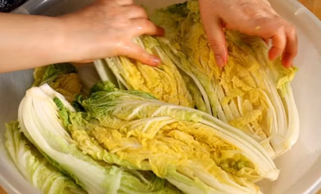 Cải thảo tách từng lá và cắt thành 3 khúc. Rửa sạch với nước lạnh, sau đó ngâm với thật nhiều muốn hạt cho đến khi mềm,có thể vắt khô nước, thì cả nhà rửa nhiều lần với nước sạch cho hết rồi vắt khô nước, cho vào rổ phơi cho ráo nước nhất có thể (bước này giúp kim chi thắm và để được lâu hơn).
