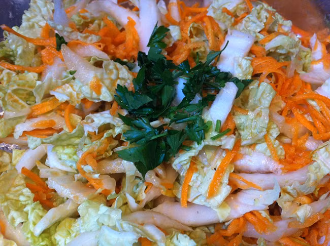 – Đợi khoảng nữa tiếng cho cải thảo, cà rốt, hẹ ráo nước và héo vào, trộn đều chúng lại với 1 muỗng ớt bột, sau đó đỗ hỗn hợp nước mắm vào trộn đều.