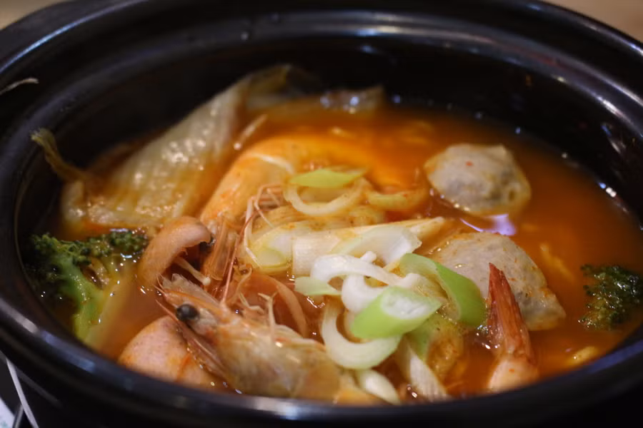 Khi ăn, bật bếp nấu sôi nước dùng có kim chi, lần lượt bỏ vào tôm, mực, nấm kim châm, bông cải.