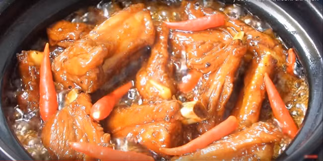 Bước 3: Bạn cho thêm 100ml rồi đậy nắp, kho đến khi nước hơi sệt lại, đảo đều để các miếng sườn chín kĩ. Sau khi món sườn đã gần được rồi thì bạn thêm ớt vào, nêm nếm lại cho hợp khẩu vị.