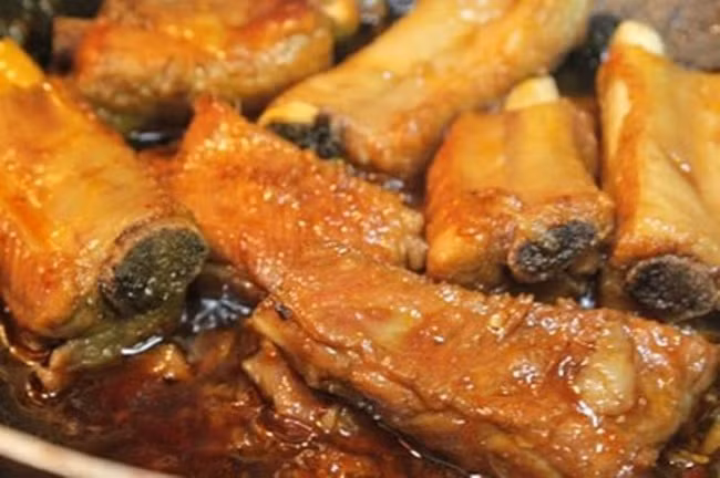 Nếu sườn đã chín mềm mà còn nhiều nước thì bạn mở vung nồi ra cho cạn bớt nhé, chỉ để lại một chút nước sền sệt đủ bám quanh miếng sườn cho bóng đẹp thôi.