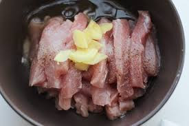 Thịt sau khi mua về, rửa sạch, thái thành miếng nhó. Cho thịt vào bát, thêm dầu hào, nước tương, rượu nấu ăn, hạt tiêu, bột năng và đập 1 quả trứng và gừng vào trộn đều.