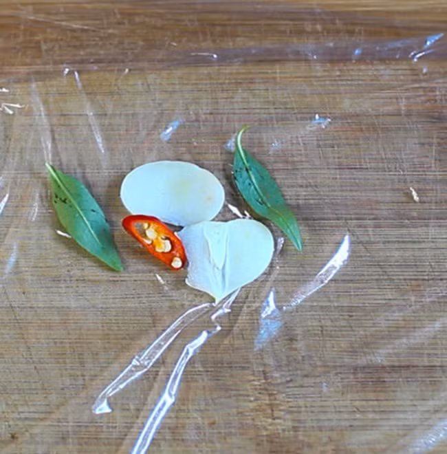 Sau khi ủ, dùng thìa đánh hỗn hợp làm nem lại một lần nữa cho thật đều. Tiếp đến, trải màng bọc thực phẩm ra, xếp lên vài lát tỏi, ớt và lá đinh lăng rồi cho một ít hỗn hợp nem vào.