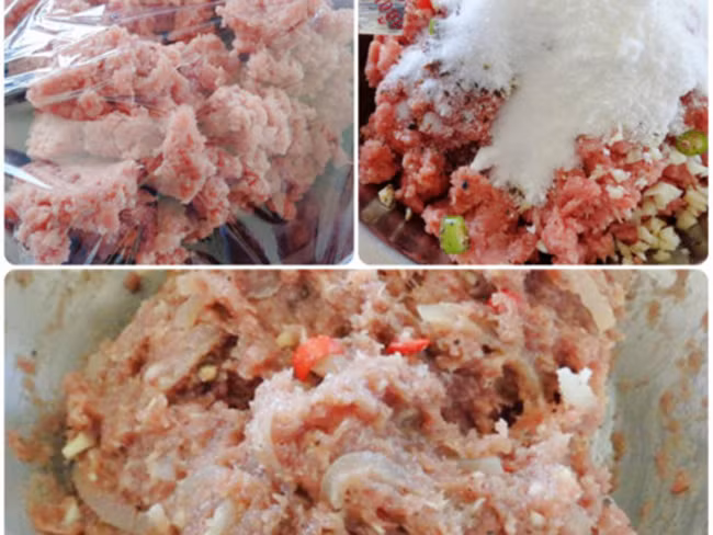 Sau khi chuẩn bị xong các nguyên liệu như ở bước 1, chuẩn bị tiếp một chiếc bát tô to. Sau đó, cho vào bát tô toàn bộ thịt xay, bì lợn cùng với các loại gia vị như muối, mì chính, mắm, tiêu, đường phèn tán nhuyễn, tỏi băm nhỏ và thính gạo.