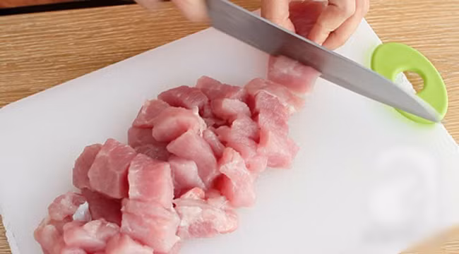 Đầu tiên, lấy thịt heo rửa sạch, lau thật khô, cắt khối vuông, chia nhỏ làm 2-3 cho vào bọc (cho vừa với một lần máy xay). Rồi cho vào tủ đông khoảng 1 giờ.