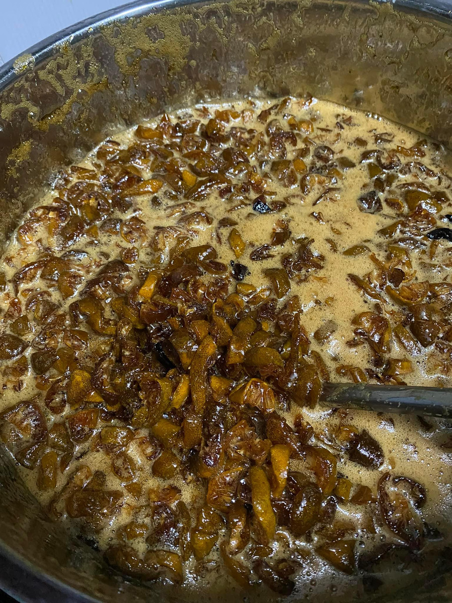 1/2 chỗ đường phèn còn lại thì sên vỏ quất. Với em đây là linh hồn của siro, vì nó ngon khó tả lắm. Cứ sên đường nhỏ lửa cùng chút nước siro vừa đun trong khoảng 1 tiếng cho đến khi nhìn thấy vỏ quất trong suốt, đậm màu là được. Lúc này mới trộn chung cùng với siro.