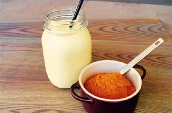 Bước 2: Khi sữa vừa đủ ấm (chưa sôi), bạn cho bột nghệ vào, sau đó khuấy đều nhanh tay cho bột nghệ tan.