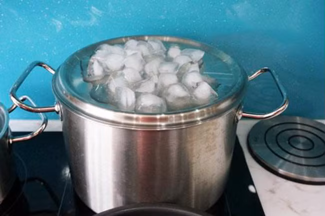 4, Đun lửa liu riu cho đến khi đá tan hết thì tiếp tục cho đá lạnh khác lên trên. Sau khoảng 30 – 45 phút đun thì bạn sẽ thu được 1 bát tinh dầu bưởi nguyên chất.