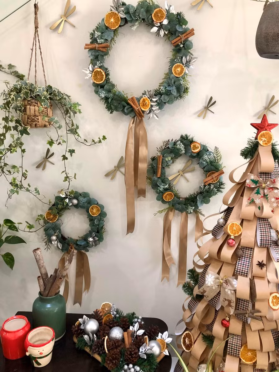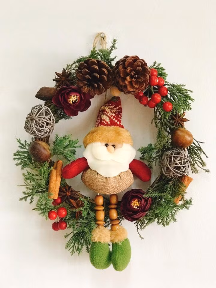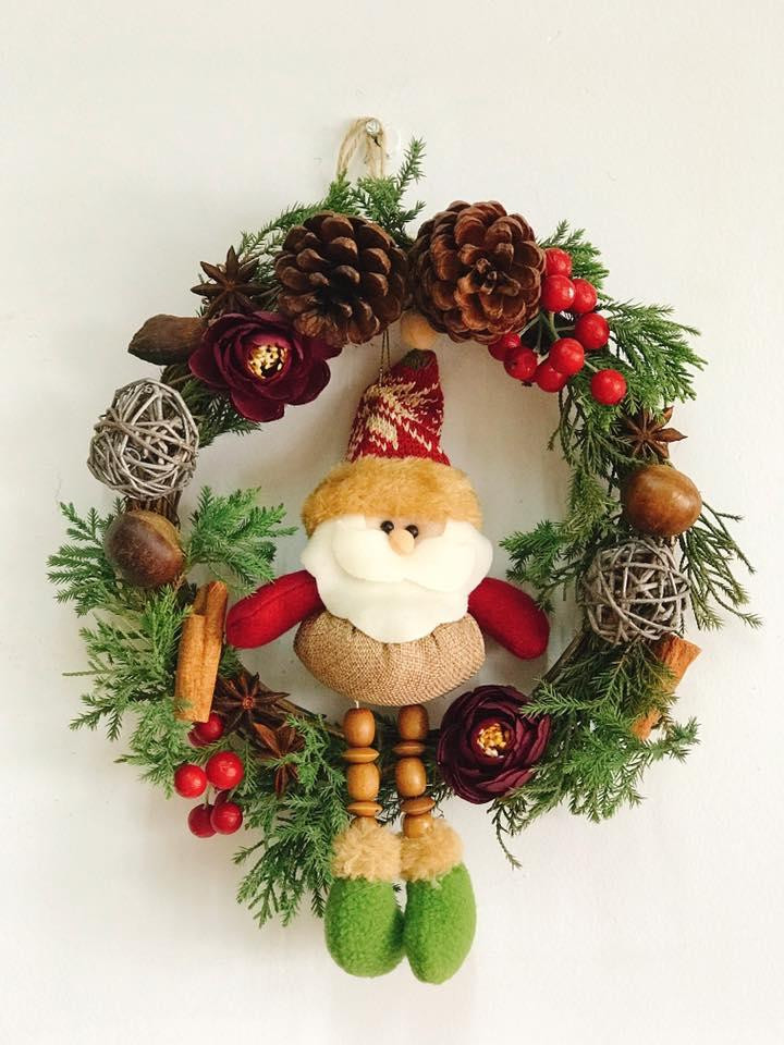 | Sau đó là các đồ trang trí. Các bạn dùng dây đồng mảnh để buộc các món đồ trang trí vào vòng. Nhớ luồn qua lá nhé để không bị bẹp lá mất form. Cũng có thể dùng dây thừng để buộc đồ trang trí. |