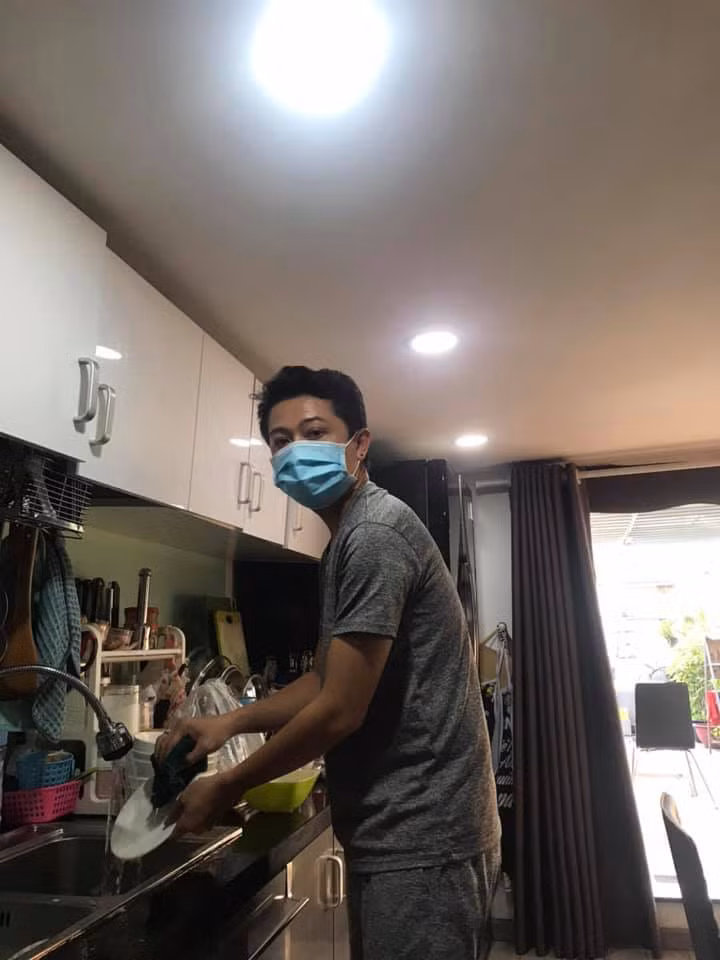 Hứa Minh Đạt lại là một ông chồng hài hước khi chia sẻ những ngày nghỉ dịch này ngoài việc chăm sóc cây cối ngoài vườn nhà thì còn được vợ đào tạo thêm nghề rửa bát.