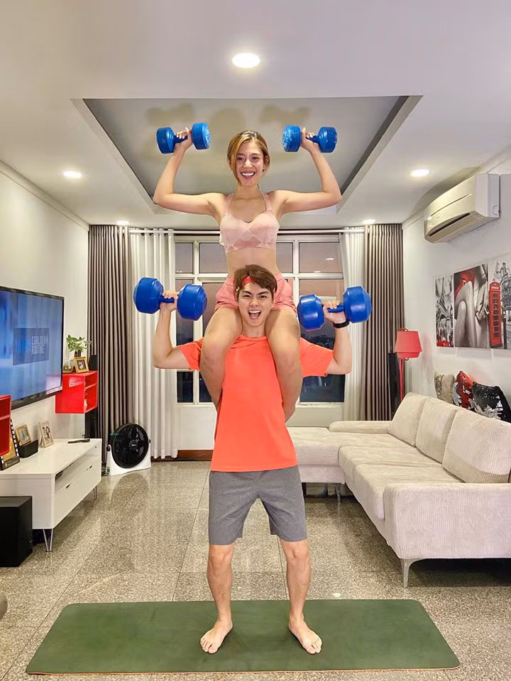 Bên cạnh đó, trong những ngày nghỉ dịch thì Jay Quân còn không quên nhắc vợ giữ dáng bằng cách tập thể dục cùng cô.