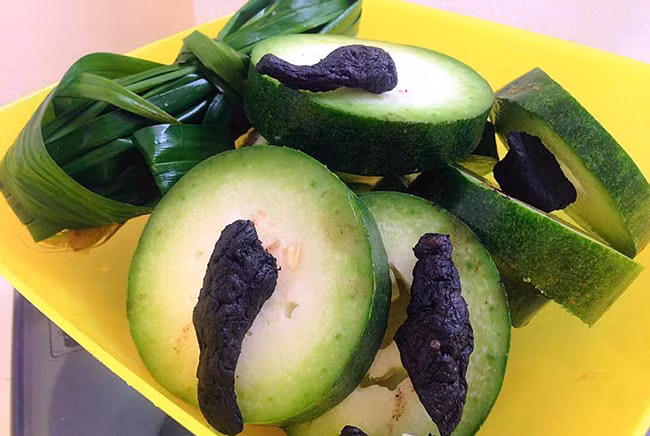 – Mía lau chẻ từng thanh nhỏ đặt dưới đáy nồi, rồi tới bí đao cắt khoanh để nguyên vỏ và ruột, thục địa cắt miếng, la hán quả bẻ ra, sau đó cho nước lạnh vào nấu.