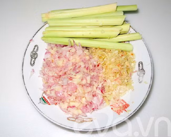 1, Lấy khoảng 6 củ sả băm nhỏ, phần thân trên đập dập để riêng. Hành tím, tỏi mỗi loại 1 củ, bằm nhỏ.