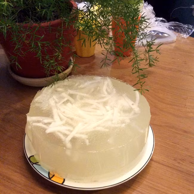 Khuấy đến khi hỗn hợp hơi sệt lại thì mọi người cắt cơm dừa cho vào trong nồi. Khuấy thêm 1 tí nữa thôi rồi tắt bếp (có thể rót ra khuôn cho đẹp)