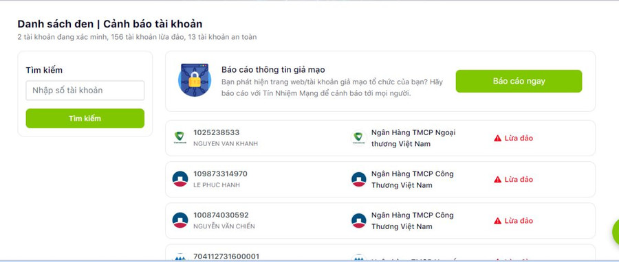 Tại đây, người dùng chỉ cần gõ số tài khoản ngân hàng cần tra cứu và bấm Tìm kiếm, hệ thống sẽ ngay lập tức trả về kết quả nếu tài khoản nằm trong danh sách lừa đảo.